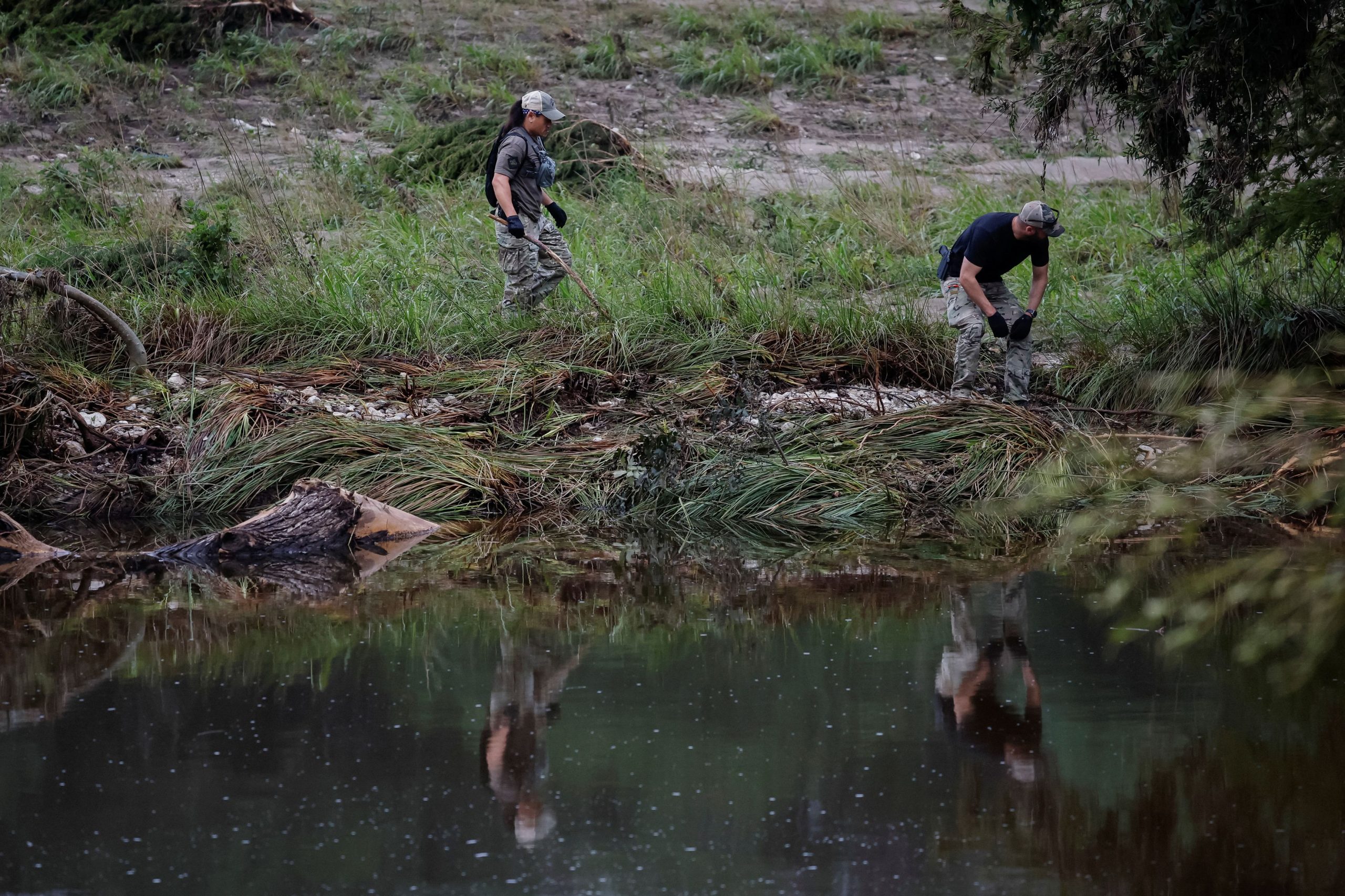 Law enforcement members work in recovery operations following flooding on the Guadalupe River, in Camp Mystic, Hunt, Texas, U.S. July 7, 2025. REUTERS/Marco Bello