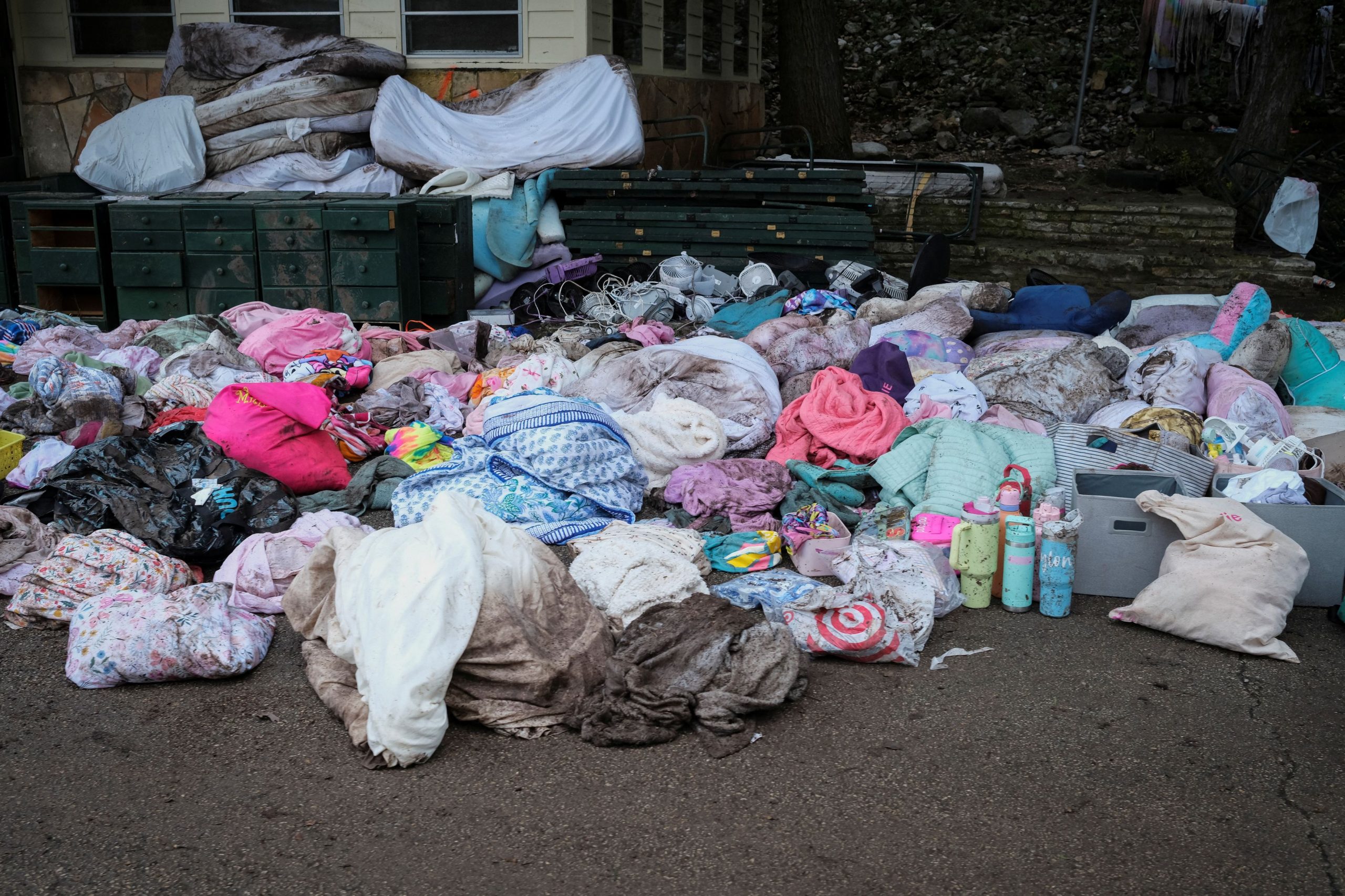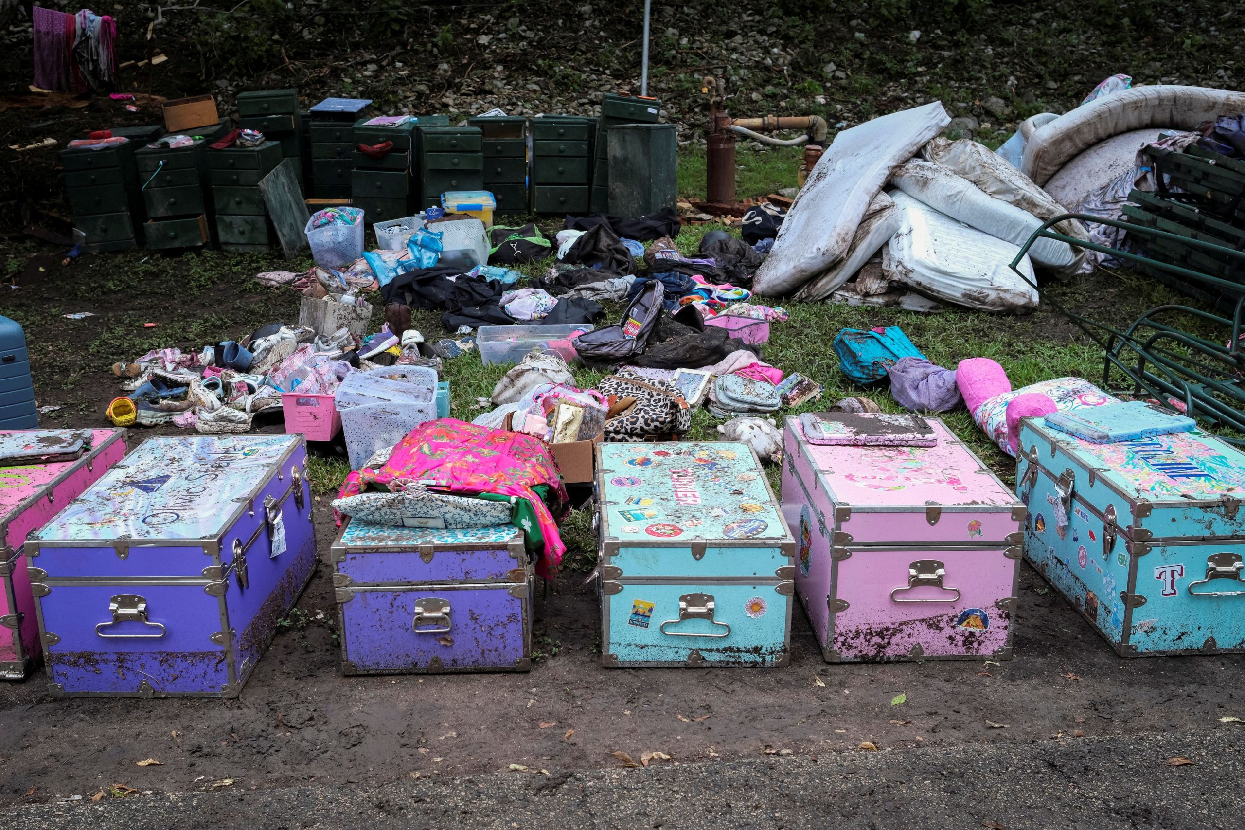 Campists’ belongings lie on the ground following flooding on the Guadalupe River, at Camp Mystic, Hunt, Texas, U.S. July 7, 2025. REUTERS/Marco Bello