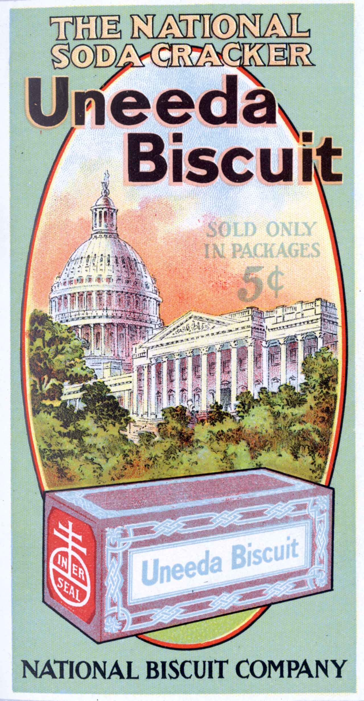 Advertisement for Uneeda Biscuit features an illustration of the US Capitol building and a box of crackers, 1912. It originally appeared in Herbert Cecil Duce’s ‘Poster Advertising’ (published by Blakely Printing). (Photo by Transcendental Graphics/Getty Images)