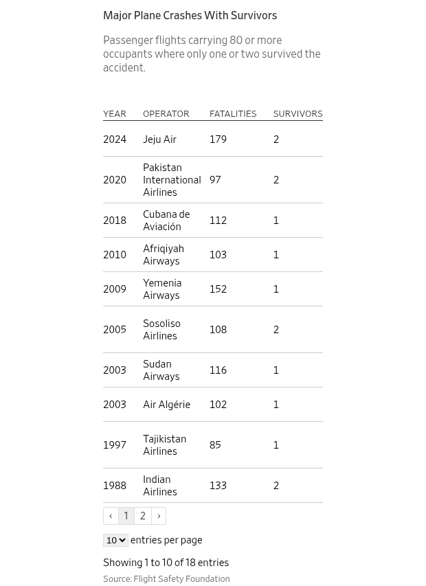 They are on a very short list among aviation’s worst disasters. Over the past eight decades of commercial travel, there have been just 17 other crashes where planes carrying 80 or more occupants left a sole survivor or two, according to data collected by the Flight Safety Foundation, an international nonprofit that provides safety guidance.