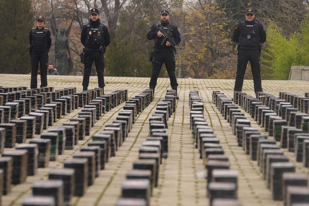 Police officers stand by part of a haul of 11 tons of cocaine, displayed in the patio of a police station in Madrid, Spain, Tuesday, Dec. 12, 2023. (AP Photo/Paul White)