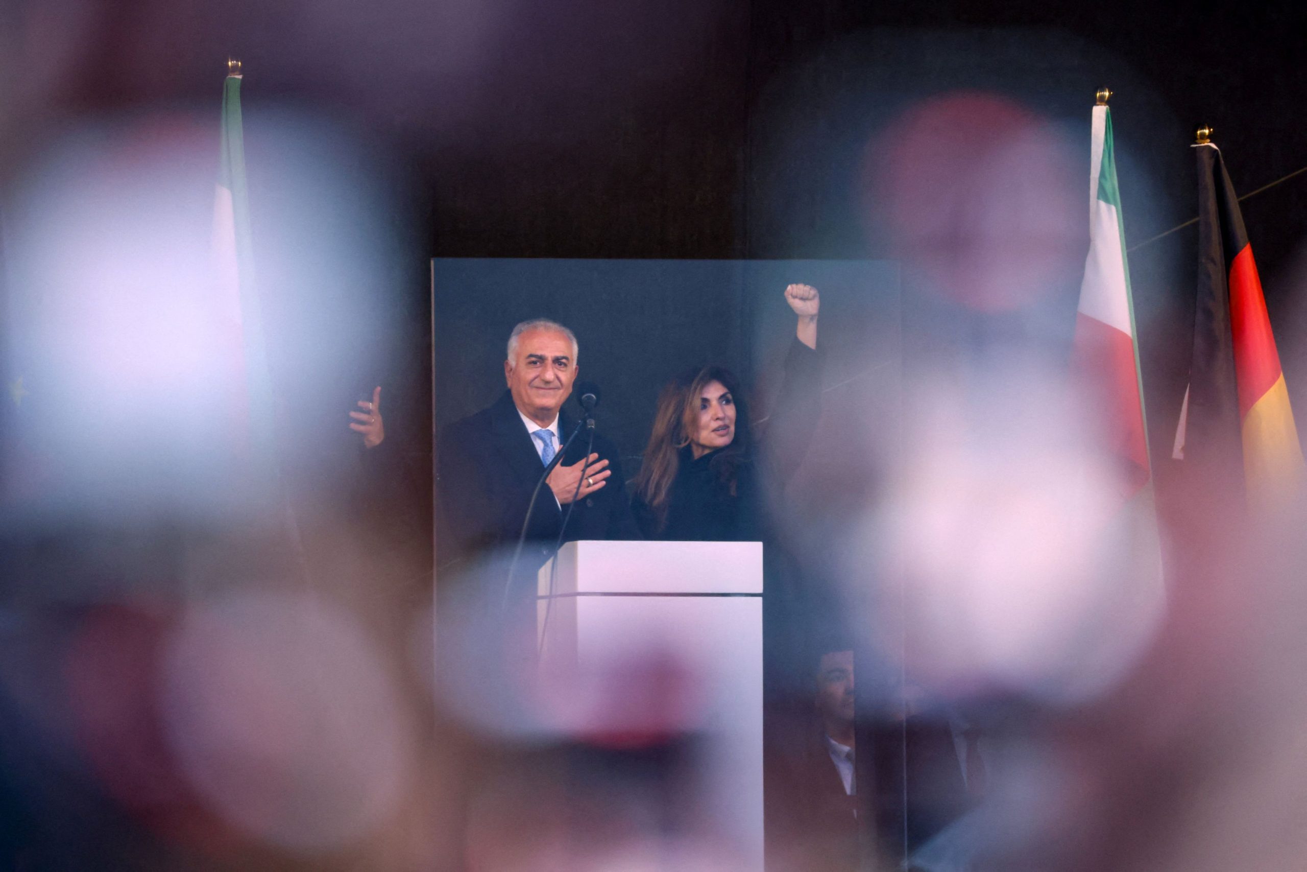 Reza Pahlavi, the exiled son of Iran’s last shah, and wife Yasmine Pahlavi at a rally in Munich last week. REUTERS/Thilo Schmuelgen