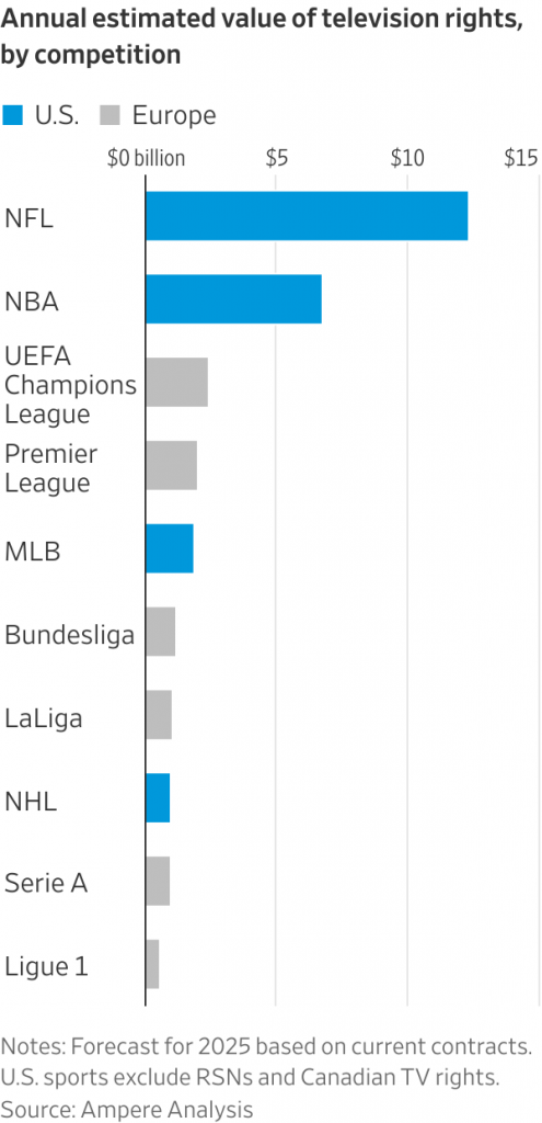 The big gap is in media rights. Broadcasting the NFL and the NBA is worth about $12 billion and $7 billion a year, respectively, compared with about $2 billion each for the Premier League and the UEFA Champions League, according to Ampere Analysis.