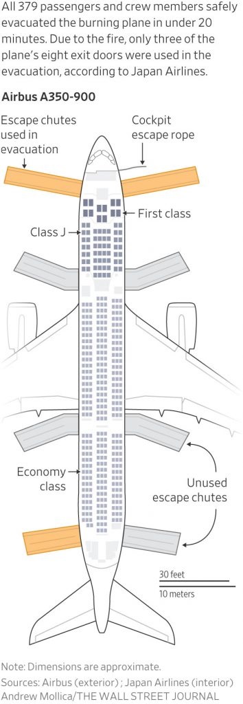 Japan Airlines said it took some time to get the doors open because flight attendants first needed the pilot’s confirmation that the airplane had come to a complete stop and they needed to check whether it was safe to evacuate.