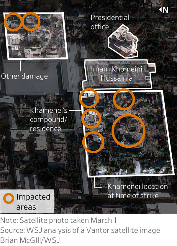 Khamenei was above ground at his residence with his family during the strikes. Satellite imagery shows that area sustained the most visible damage.