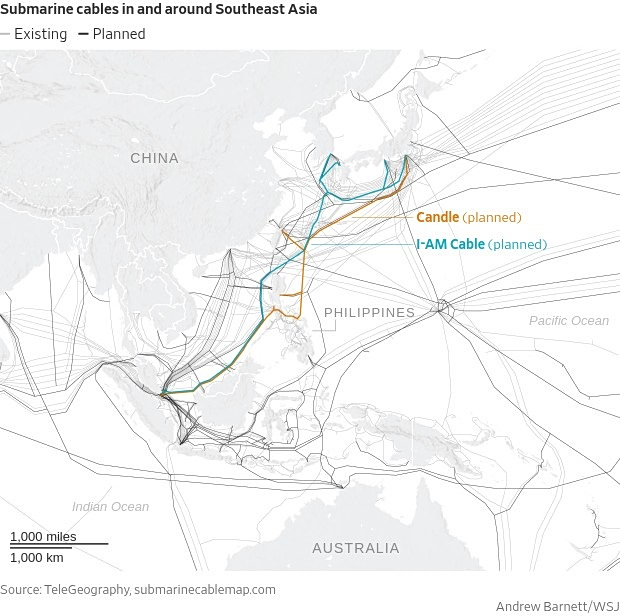 Some planned cables opt for a more geopolitically secure route. The I-AM Cable, for example, will avoid the center of the disputed South China Sea, tracking near the coast of the Philippines, according to a TeleGeography database. Another, Candle, will go east of the Philippines for part of its route.