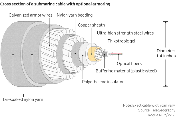 The dragging of ship anchors, a main way cables get taken out, can damage even armored cables, which are wrapped in steel wire but still roughly the diameter of a ping-pong ball. When close to shore, cables are buried, but they can be buried only so deep.
