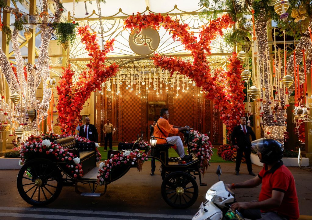 A motorised carriage passes by the decorated gate of Antilia, the Ambani residence, during the pre-wedding ceremony of Anant Ambani and Radhika Merchant, in Mumbai, India, July 3, 2024. REUTERS/Francis Mascarenhas