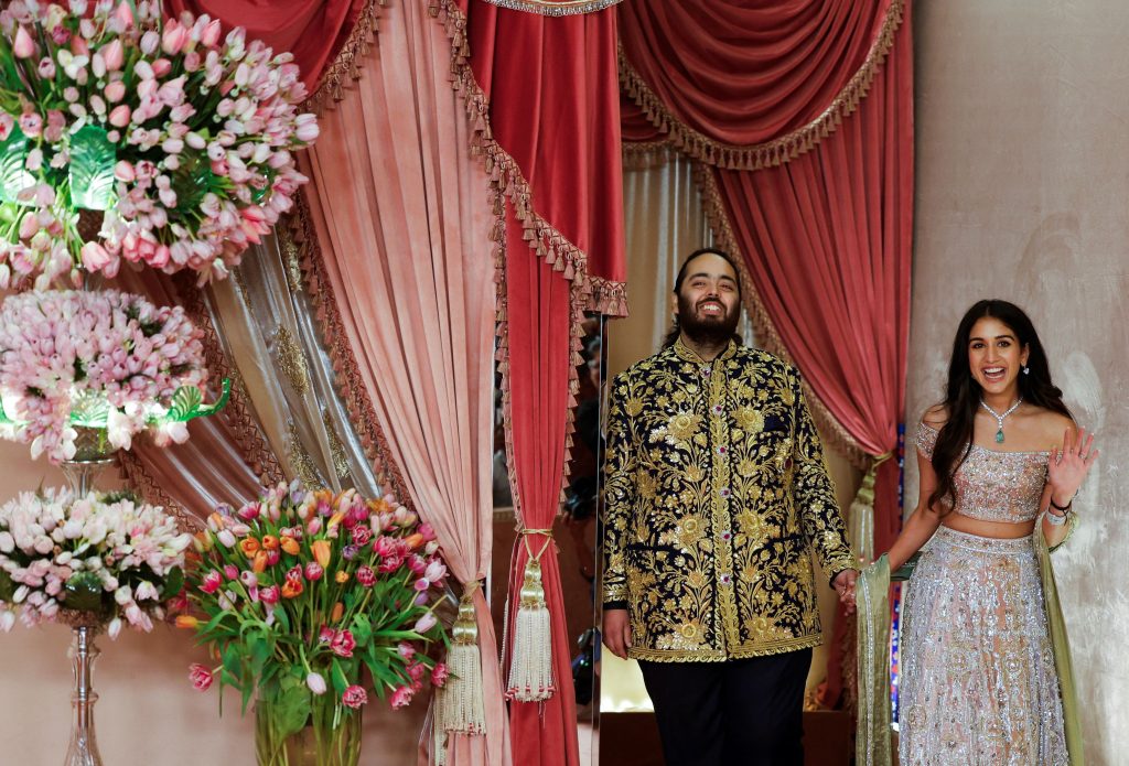 Anant Ambani, son of businessman Mukesh Ambani, arrives with his fiance Radhika Merchant on the red carpet during the sangeet ceremony at Jio World Centre, Mumbai, India, July 5, 2024. REUTERS/Francis Mascarenhas