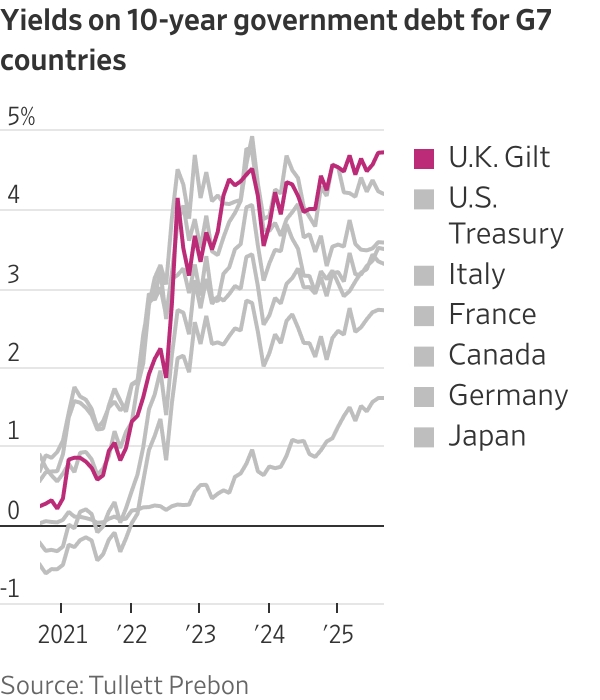 Investors now demand a slight premium to lend to the U.K., whose borrowing costs have risen sharply in recent years, partly as a result of persistently high inflation. Yields on 30-year government bonds, or gilts, this past week hit levels last since in the late 1990s, rising higher than those of France, which has a bigger debt load. The yield on U.K. 10-year debt is now the highest in the Group of Seven nations, eclipsing the U.S.