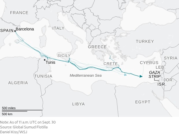 The Global Sumud Flotilla set off in recent weeks from ports in Spain, Tunisia, Italy and Greece, converging in the Mediterranean. The group takes its name after the Arabic word sumud, meaning resilience, which is often associated with the Palestinian cause. It is a heterogeneous assortment of around 500 activists, politicians, public figures and ordinary citizens from 46 countries around the world. The largest groups by nationality are Italian, Spanish and Turkish. Passengers include Swedish climate campaigner Greta Thunberg and a grandson of Nelson Mandela.