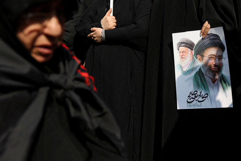 A woman holds an image of Iran’s new supreme leader, Mojtaba Khamenei, alongside late Iranian Supreme Leader Ayatollah Ali Khamenei, during a funeral ceremony for the Iranian military commanders who were killed in strikes, amid the U.S.-Israeli conflict with Iran, in Tehran, Iran, March 11, 2026. Majid Asgaripour/WANA (West Asia News Agency) via REUTERS