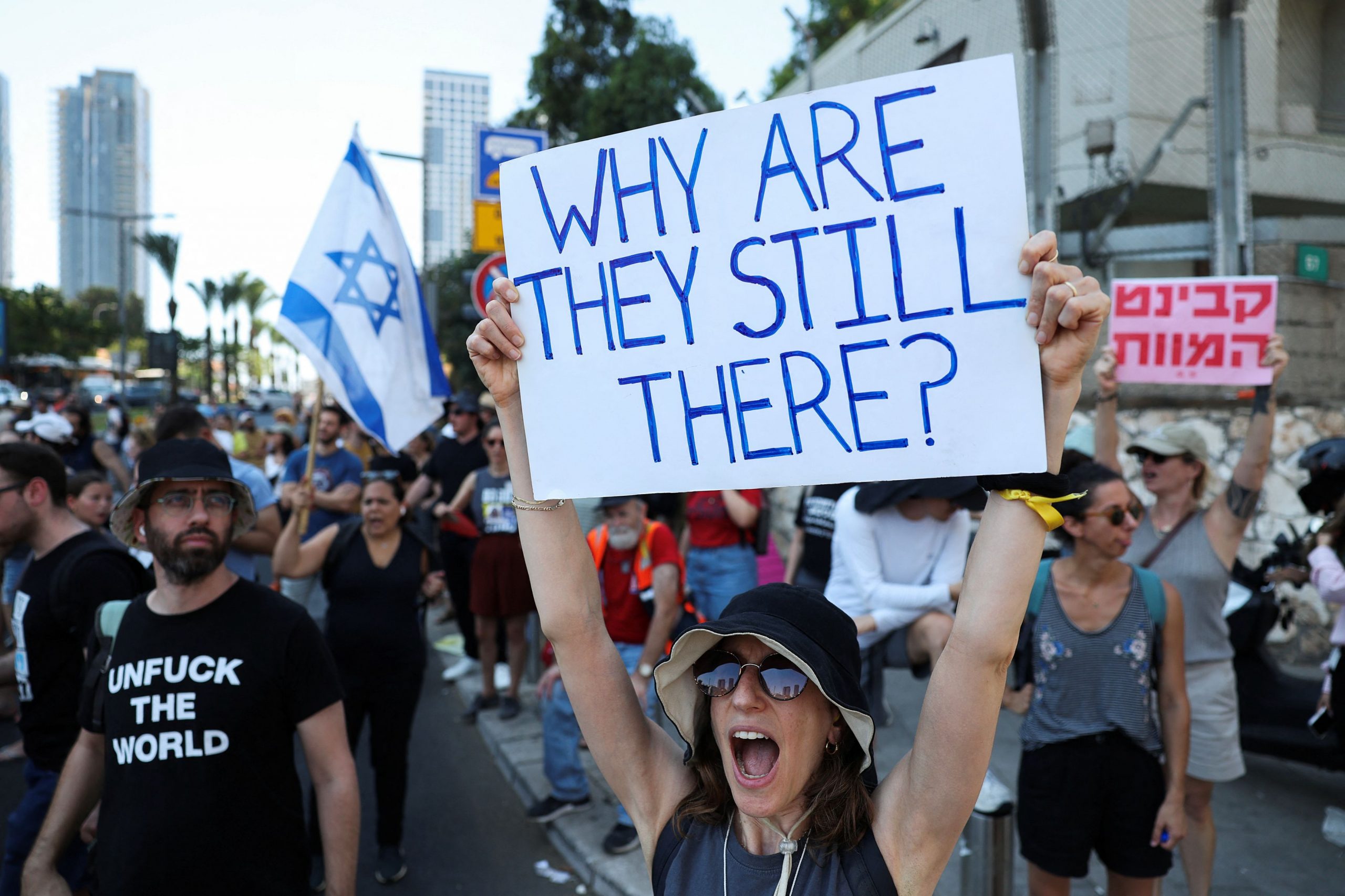Tens of thousands of Israelis marched in the streets on Sunday night in impromptu protests across the country, and four of the six hostages whose bodies were recovered on Sunday were laid to rest. The funeral of American-Israeli Hersh Goldberg-Polin, who was among those killed, is expected to draw large crowds on Monday afternoon. The hostages, who were found by the Israeli military in a tunnel in Rafah, were likely shot to death 48-72 hours before Israeli forces discovered them, the health ministry said on Sunday.