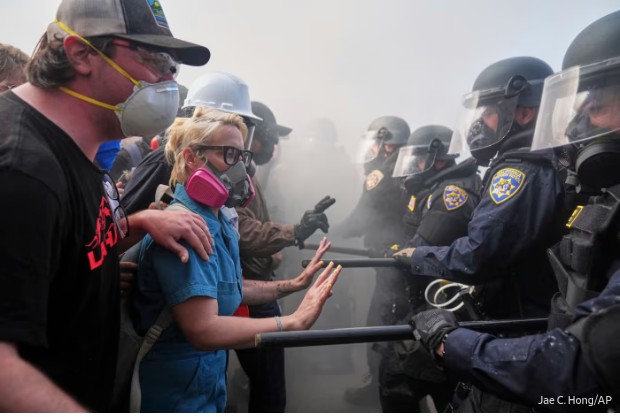 San Francisco police said that at about 7 p.m., some people became violent and committed assault, vandalism and property damage. The police declared an unlawful assembly and told people to leave, but some remained in the area.