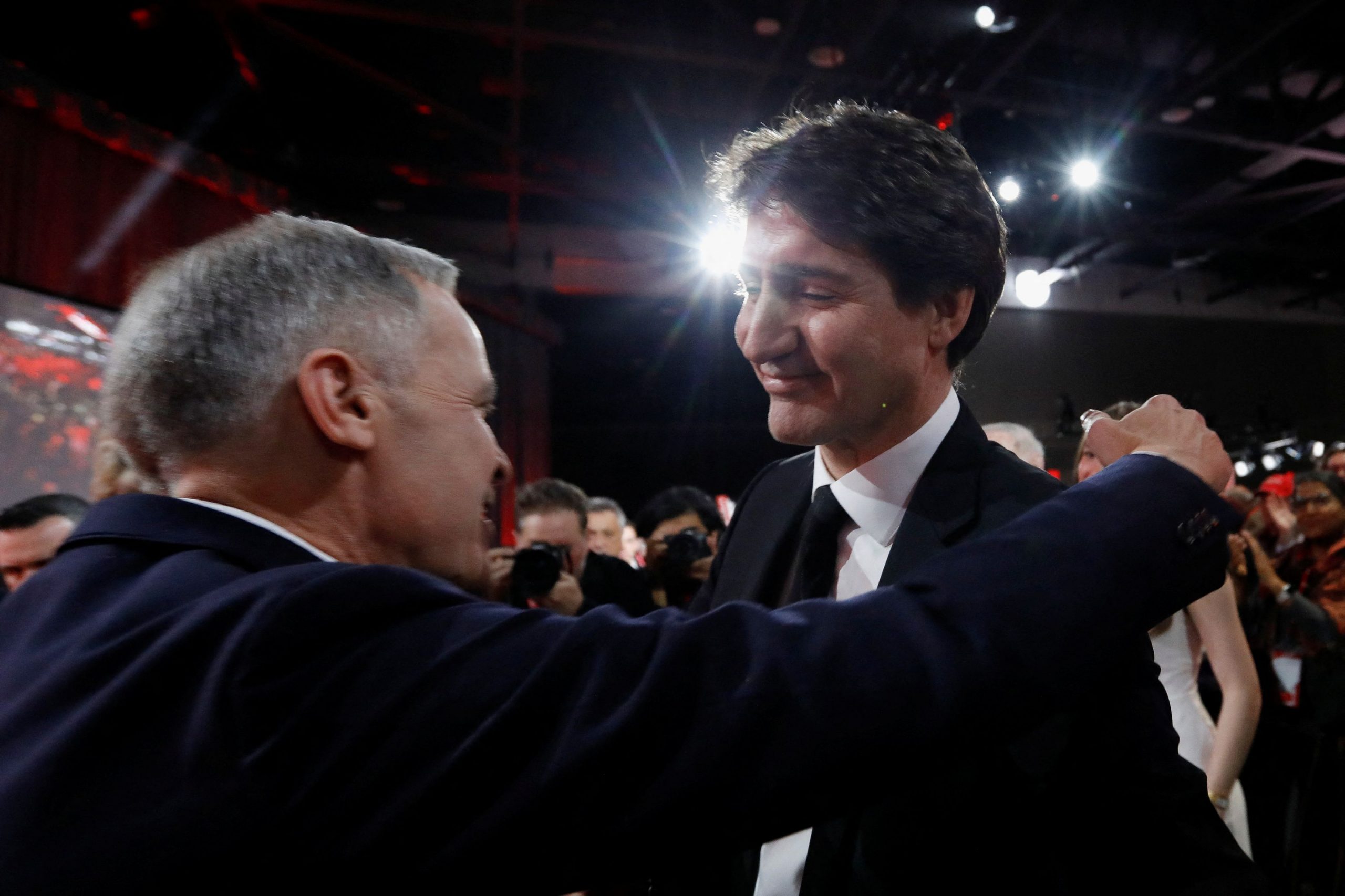 Former Bank of Canada and Bank of England governor Mark Carney and Justin Trudeau embrace after Carney won the race to become leader of Canada’s ruling Liberal Party and will succeed Justin Trudeau as Prime Minister, in Ottawa, Ontario, Canada, March 9, 2025. REUTERS/Amber Bracken/Pool