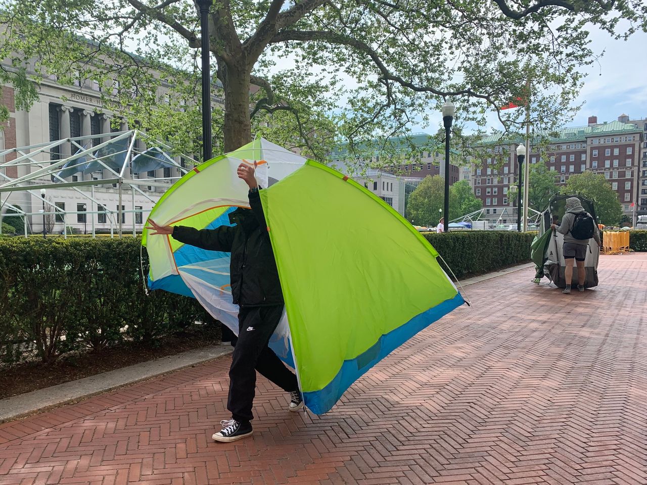Protester moves a tent on Columbia University campus Tuesday. PHOTO: ERIN AILWORTH/THE WALL STREET JOURNAL