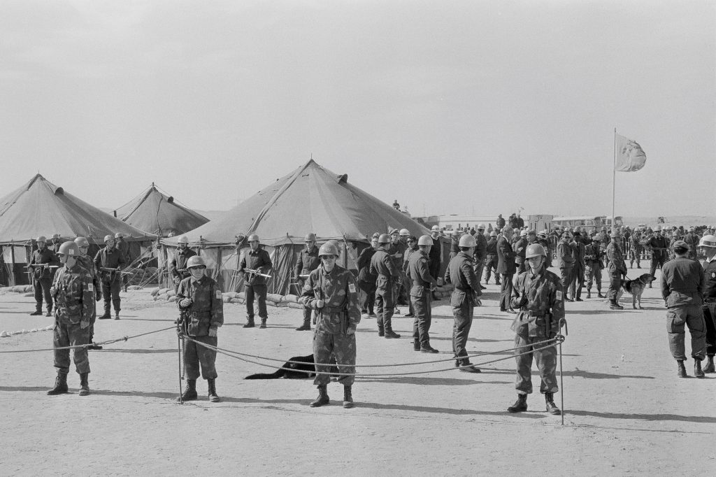 U.N. troops guard tents where Israeli and Egyptian chiefs of staff are meeting to discuss the separation of their respective forces, at KM 101 on the Suez-Cairo highway, Jan. 20, 1974. The chiefs of staff are Lt. Gen. David Elazar of Israel, and Lt. Gen. Mohammed Gamasy of Egypt. (AP Photo/Max Nash)