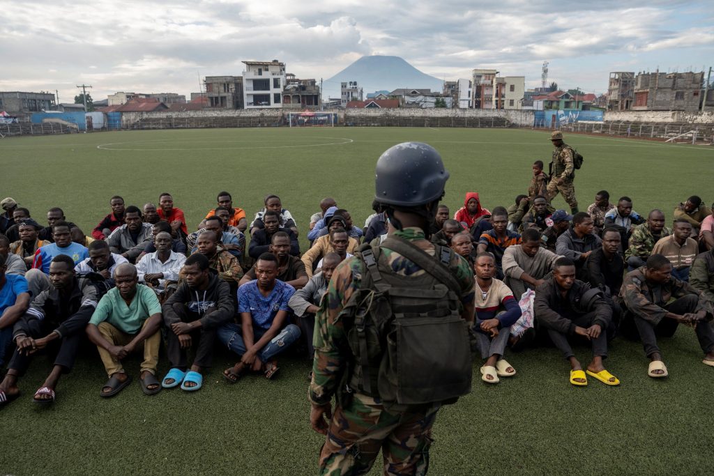 A M23 rebel stands guard at the the Unite stadium as members of the armed forces of the Democratic Republic of the Congo (FARDC) and Wazalendo troops wait to be taken aboard trucks for training by M23 rebels, in Goma, North Kivu, Democratic Republic of Congo, May 10, 2025. REUTERS/Arlette Bashizi
