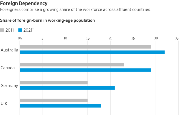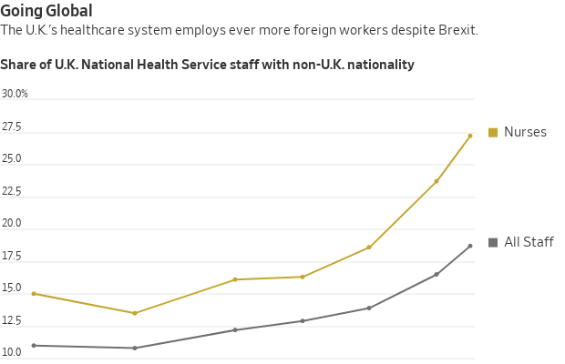 Despite promising for decades to curb immigration, the U.K. has seen a surge since its 2020 exit from the EU, as businesses scramble for employees. More than 27% of the National Health Service’s nurses are from abroad today, up from around 14% in 2013. In Germany, roughly 80% of slaughterhouse workers are migrants, unions estimate.