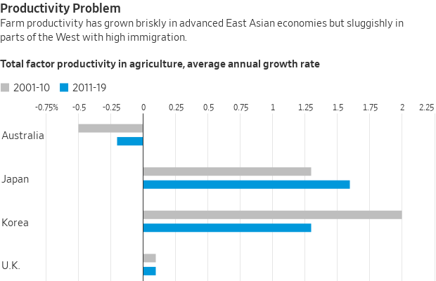 Labor productivity growth has been sluggish across advanced economies in recent years. In the U.S. and U.K. farming sectors, productivity has flatlined for a decade or longer. In Japan and Korea, which have more restrictive immigration policies, it increased by around 1.5% a year, OECD data show.