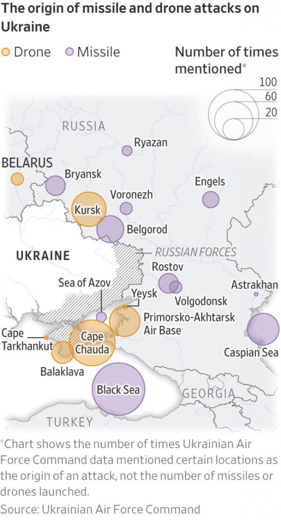For now, Russia continues to attack Ukraine with missiles and drones from locations to the country’s north, east and south.