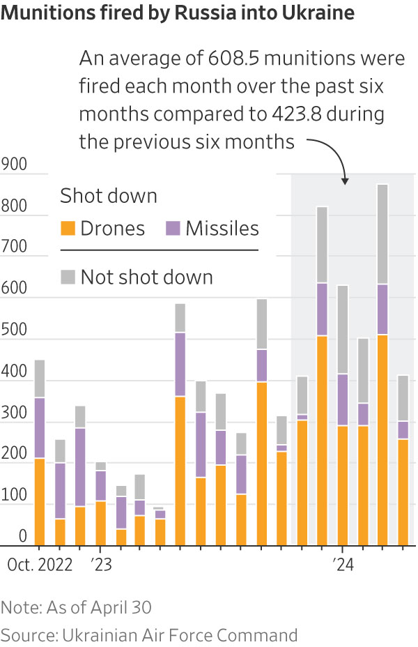 The worsening performance of Ukraine’s air defenses comes as Russia increases drone and missile attacks, and fires more harder-to-hit weapons, such as ballistic missiles. Kyiv is also running low on ammunition for the Western-supplied Patriot systems that have been its best defense against such attacks.