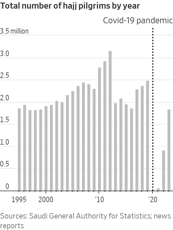 Saudi Arabia has sought to curb the number of unpermitted pilgrims with threats of arrest and fines, even as the kingdom aims to double the official capacity of the hajj to six million by 2030. But the kingdom’s efforts to build a traditional tourism industry have also made it easier for foreigners to enter the country for other purposes and hide out in Mecca waiting for the rituals to begin.