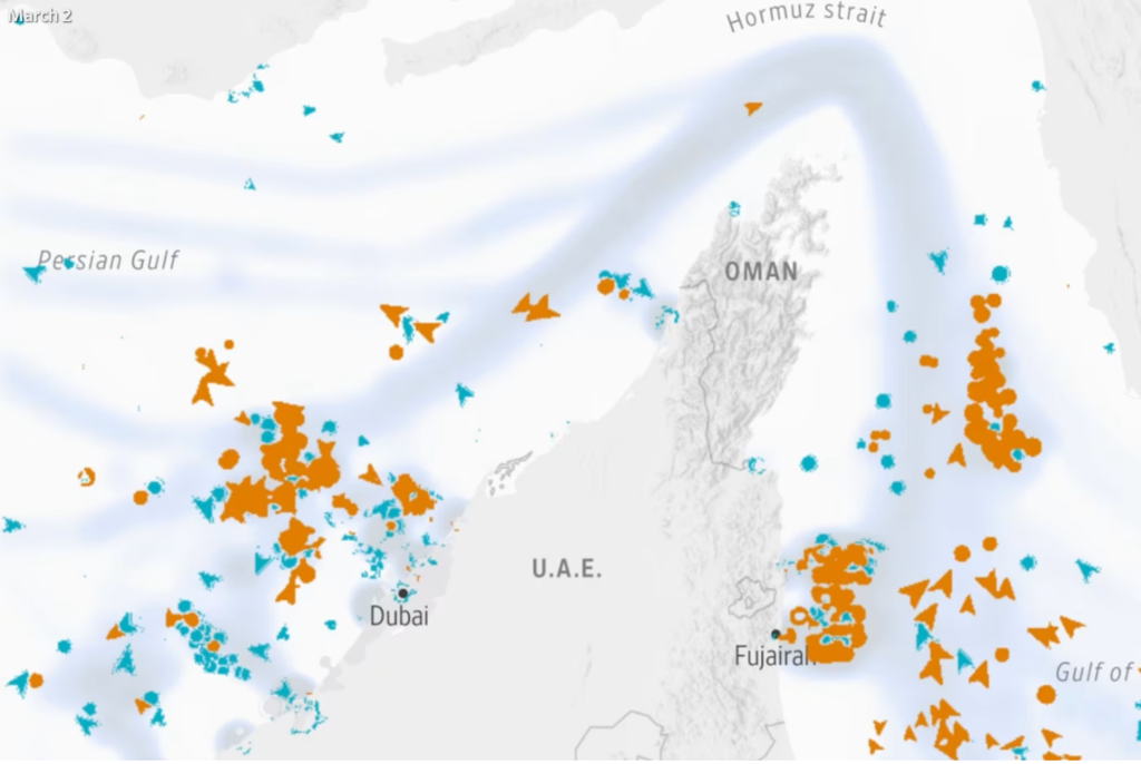 Normally, more than a hundred ships cross the strait in a given day, but after conflict broke out this past weekend, shipping nearly ground to a halt, according to MarineTraffic data. Bordered by Iran, passing ships can be vulnerable to attack.
