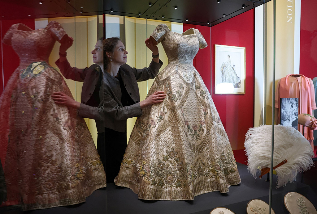 Royal Collection textile conservator Cecilia Oliver poses with the Coronation dress of 1953 forming part of “Queen Elizabeth II: Her Life in Style”, an exhibition of clothing and outfits marking the centenary of the late queen’s birth, in The King’s Gallery at Buckingham Palace, London, Britain, April 9, 2026. REUTERS/Toby Melville