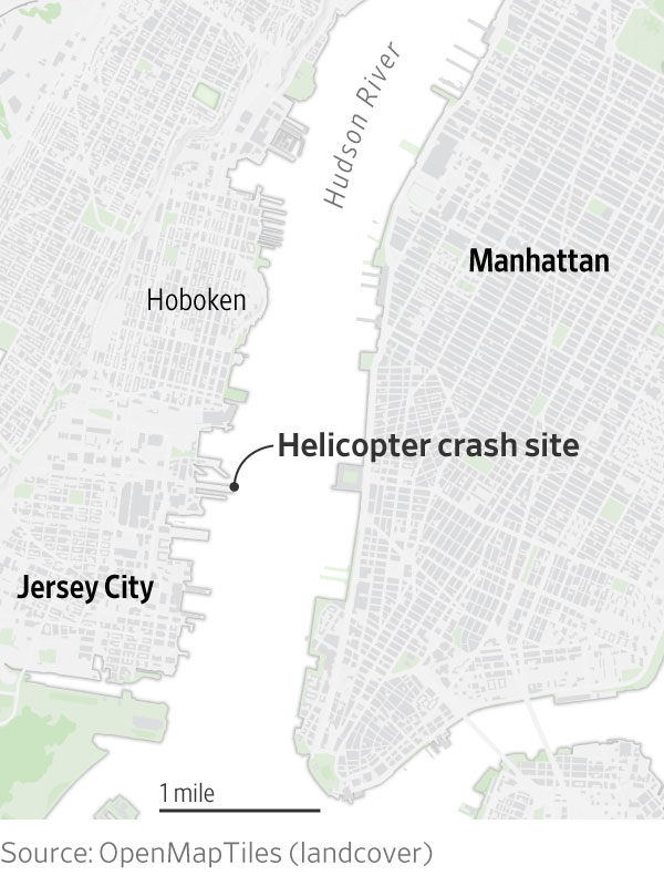 The helicopter, a Bell 206, landed in the water on the New Jersey side of the Hudson River, near Hoboken, officials said. It departed from a downtown Manhattan heliport around 2:59 p.m. and briefly traveled south before turning north up the Hudson River.