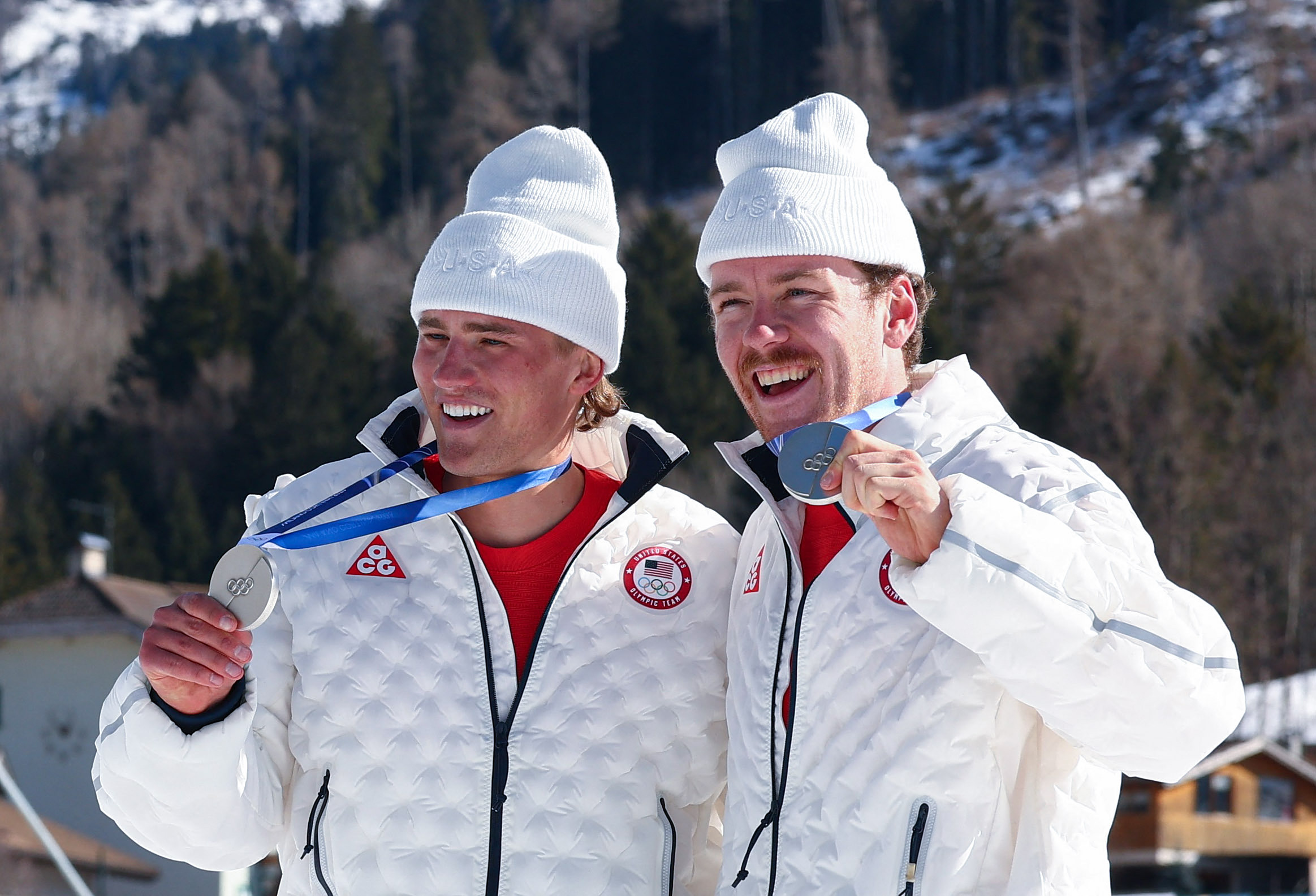 Milano Cortina 2026 Olympics – Cross-Country Skiing – Men’s Team Sprint Free Victory Ceremony – Tesero Cross-Country Skiing Stadium, Lago, Italy – February 18, 2026. Silver medallists Gus Schumacher of United States and Ben Ogden of United States celebrate with their medals during the victory ceremony REUTERS/Kacper Pempel