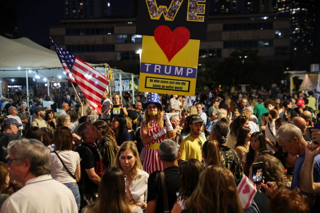 People celebrate at the “Hostages square”, after U.S. President Donald Trump announced that Israel and Hamas agreed on the first phase of a Gaza ceasefire, in Tel Aviv, Israel, October 9, 2025. REUTERS/Shir Torem