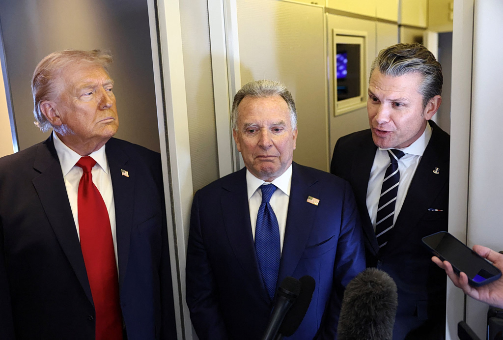 U.S. President Donald Trump and Middle East envoy Steve Witkoff listen as Secretary of Defense Pete Hegseth speaks to reporters aboard Air Force One on a flight from Dover, Delaware, to Miami, Florida, U.S., March 7, 2026. REUTERS/Kevin Lamarque