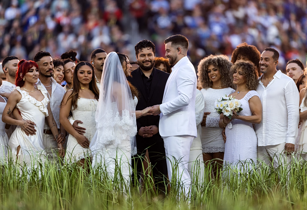 Feb 8, 2026; Santa Clara, CA, USA; A couple gets married on the stage during the Bad Bunny halftime show in Super Bowl LX between the Seattle Seahawks and the New England Patriots at Levi’s Stadium. Mandatory Credit: Mark J. Rebilas-Imagn Images