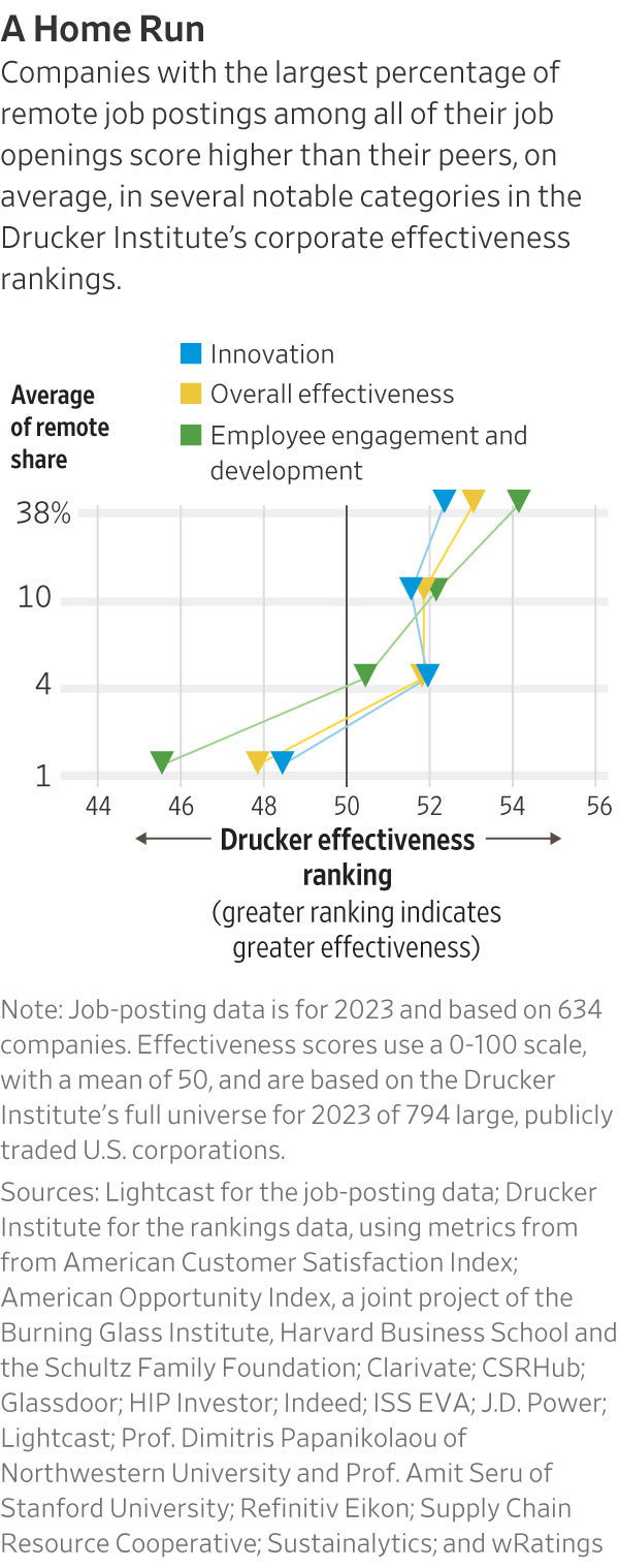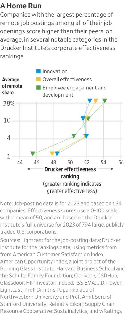 In our most recent inquiry, we examined data from Lightcast, a labor-market analytics provider, to see which companies most frequently issued remote job postings among all of their openings last year—and, in turn, how they stacked up in our innovation and our employee engagement and development categories. (It’s important to note that most jobs—caregiver, retail clerk, fast food worker, cashier, material handler and many others—can’t be done from home; only about 4 in 10 can.)