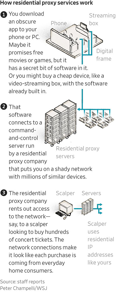 These “res proxy” companies rent out access to internet connections on the devices to customers who want to look like they’re surfing the internet from a genuine home address.