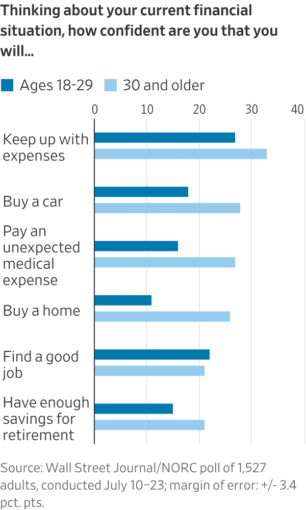 In the WSJ-NORC poll, about 23% of respondents said they were extremely or very confident that they could afford to buy a home, but only 11% felt the same about today’s children’s generation. About 32% were confident they could keep up with their expenses but less than half that share were confident of the next generation’s ability to do so.