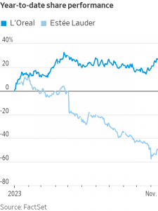 Estée Lauder shares have plunged about 50% this year, erasing roughly $45 billion in market value. Its China business has become a drag on profits. Some of its brands have been slow to tap into TikTok to reach younger consumers. Competitors are faring better, such as French giant L’Oréal, whose shares are up nearly 30% this year, or luxury conglomerate LVMH, which owns Sephora and is behind brands such as Dior fragrances and Fenty Beauty.