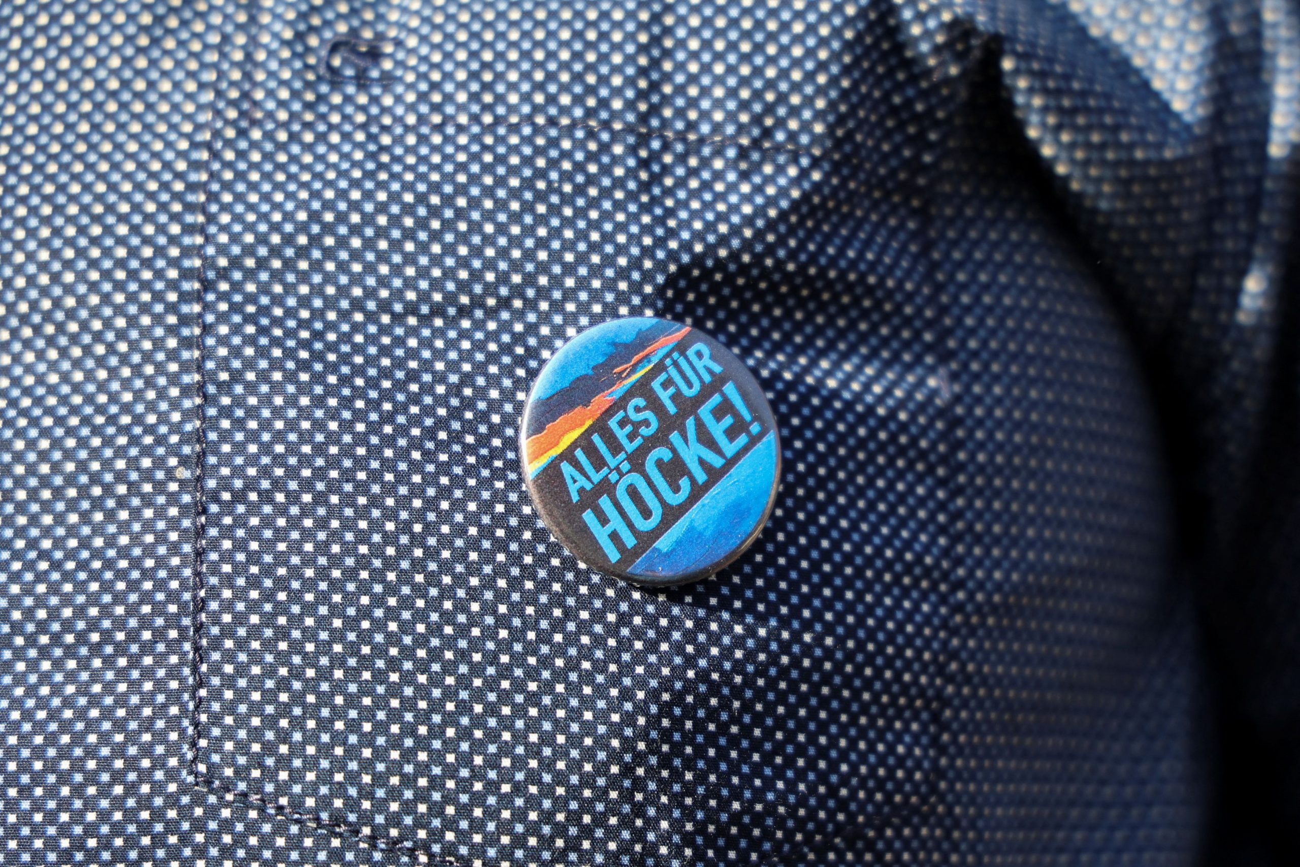 A person wears a pin in support of Bjoern Hoecke, leader of the Alternative for Germany in Thuringia (AfD), during an election campaign rally for the Thuringia state elections in Nordhausen, Germany, August 29, 2024. REUTERS/Karina Hessland