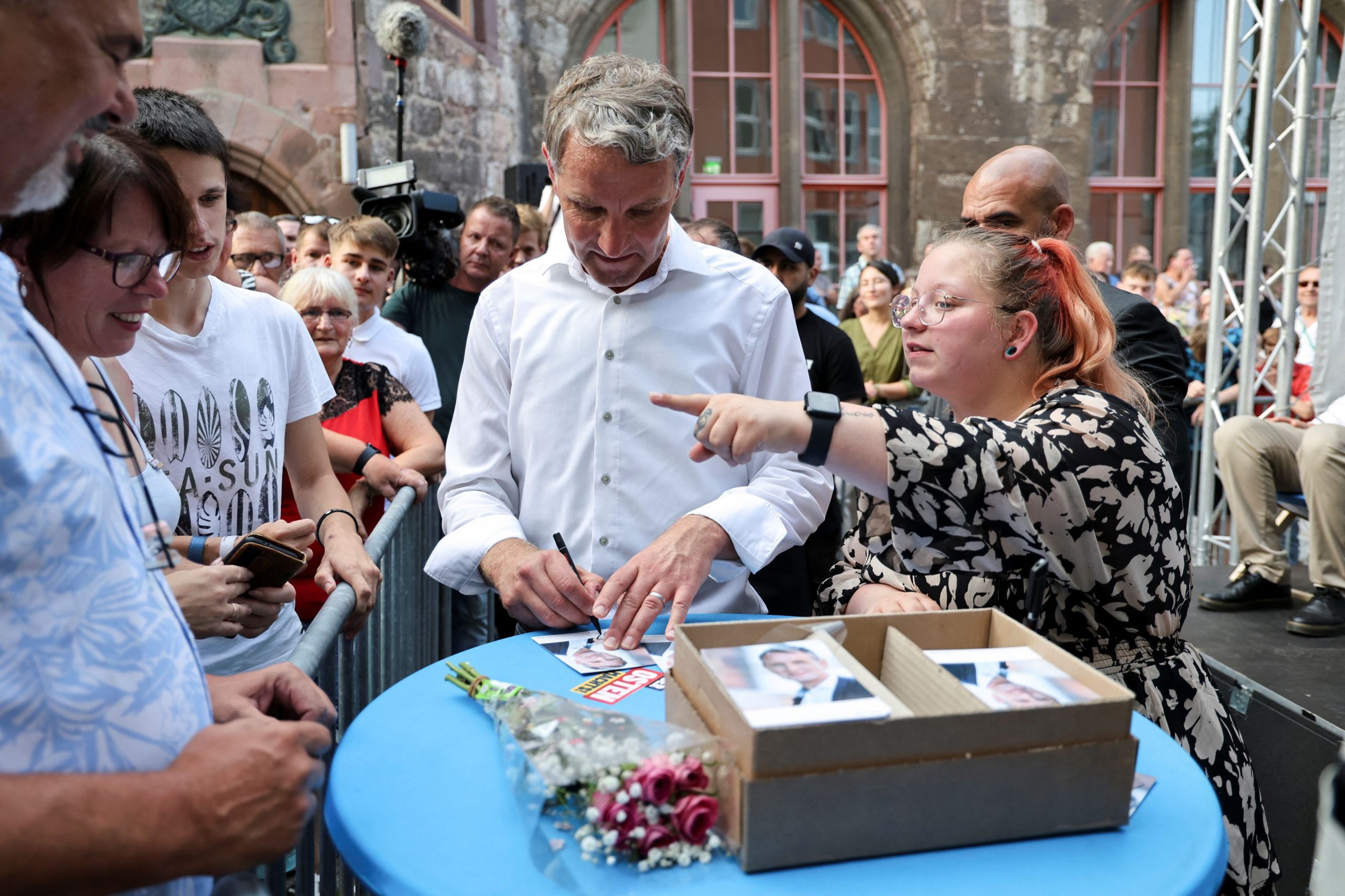Bjoern Hoecke, leader of the Alternative for Germany in Thuringia (AfD), signs a picture on the day of his election campaign rally for the Thuringia state elections in Nordhausen, Germany, August 29, 2024. REUTERS/Karina Hessland