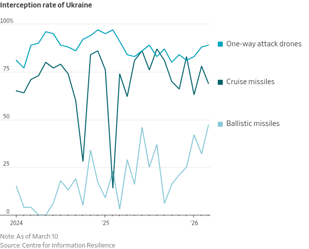 Since the start of 2024, Ukraine has shot down just 19% of ballistic missiles but 88% of long-range drones launched by Russia, according to the Centre for Information Resilience, a U.K. nonprofit.