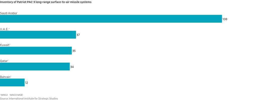 The United Arab Emirates says it has intercepted almost all the ballistic missiles flown at it, and 94% of drones. Between Feb. 28 and March 6, Qatar intercepted 97% of missiles and 72% of drones, according to research by the International Institute for Strategic Studies, while Bahrain intercepted 86% of missiles and 71% of unmanned aerial vehicles.