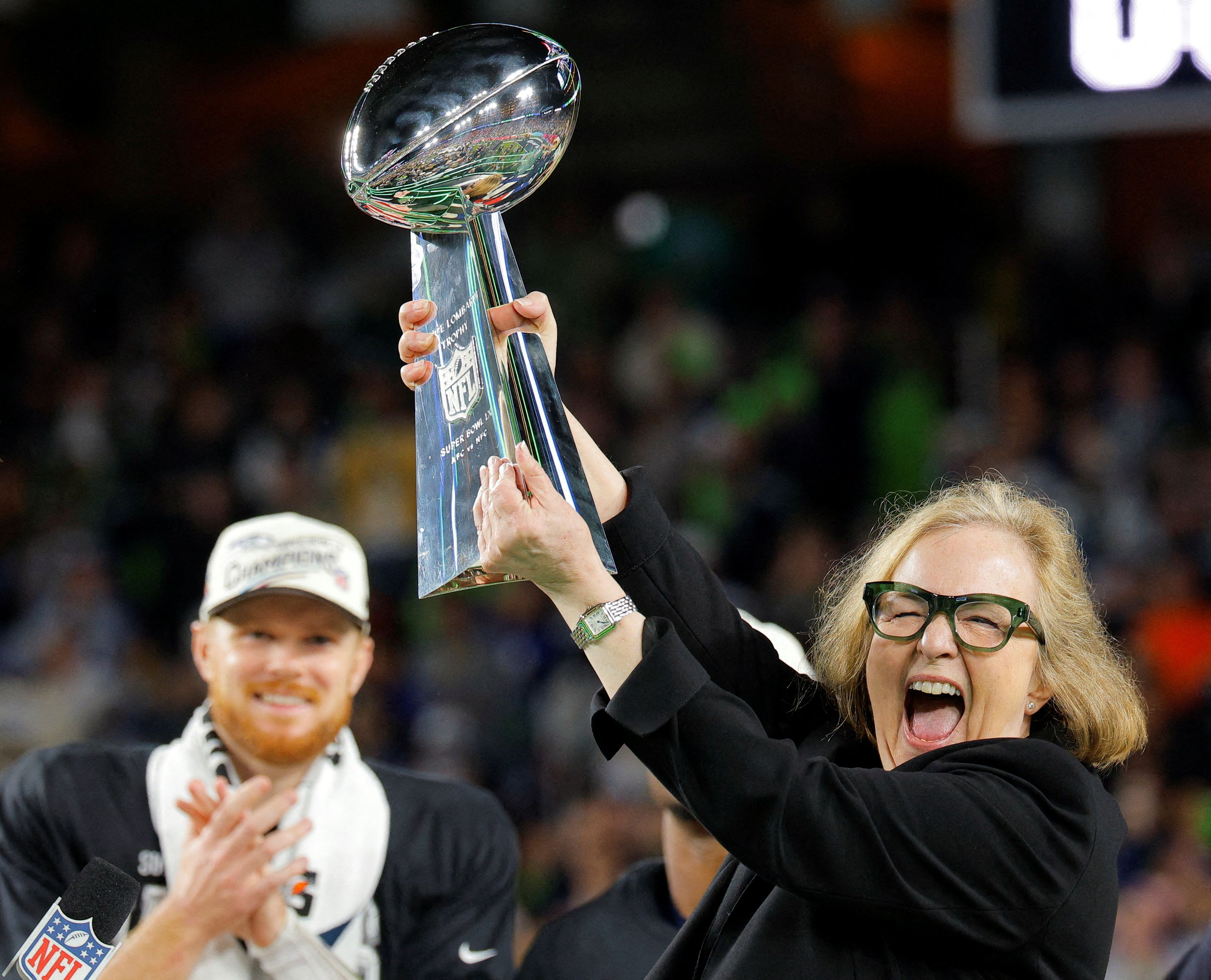 Football – NFL – Super Bowl LX – New England Patriots v Seattle Seahawks – Levi’s Stadium, Santa Clara, California, United States – February 8, 2026 Seattle Seahawks owner Jody Allen celebrates with the Vince Lombardi Trophy after Seattle Seahawks won the Super Bowl LX REUTERS/Mike Blake TPX IMAGES OF THE DAY