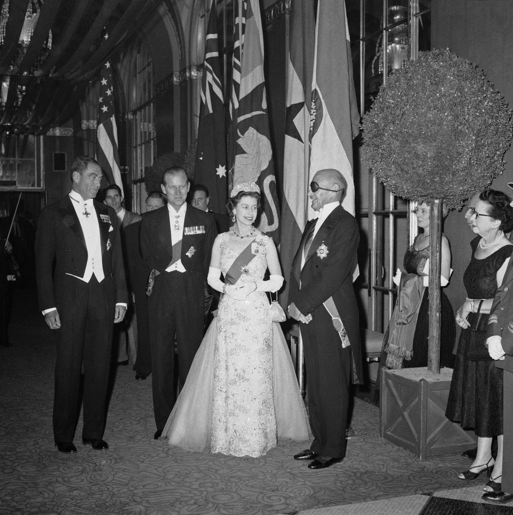 In this Oct. 21, 1957 file photo, Queen Elizabeth II and Prince Philip, center left, stand with Lewis Douglas (right), former U.S. Ambassador to Great Britain, at a dinner at New York’s Waldorf-Astoria. (AP Photo, File)
