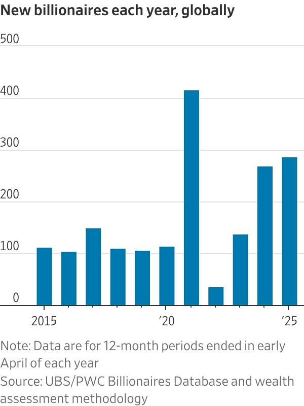 Some 2,900 billionaires now control $15.8 trillion, up from about 2,700 billionaires with a cumulative wealth of nearly $14 trillion a year earlier. The number and wealth of billionaires as a whole were boosted by the second-highest number of new billionaires minted in a year—287—since UBS began tracking that figure in 2015. Only 2021, with its flood of government stimulus and low interest rates that boosted the prices of assets, saw a higher number of new billionaires created.