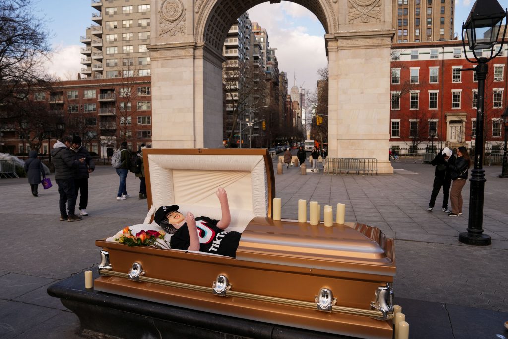 A coffin containing a blow up doll, dressed in TikTok merch is used by comic Zach Sage, who posts content on TikTok, as he films in Washington Square Park in New York City, U.S., January 17, 2025. REUTERS/Adam Gray