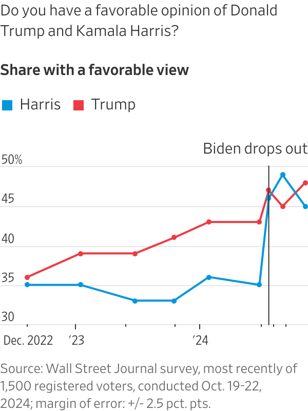 The survey suggests that a barrage of negative advertising in the campaign and the performance of the candidates themselves have undermined some of the positive impressions of Harris that voters developed after she replaced President Biden as the presumed and then confirmed Democratic nominee.
