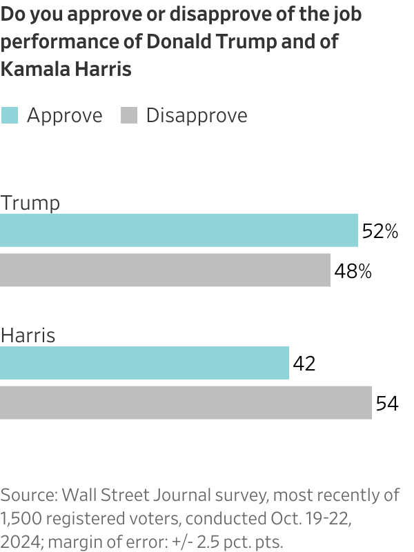 Views of Harris have turned more negative since August, when equal shares of voters viewed her favorably and unfavorably. Now, the unfavorable views are dominant by 8 percentage points, 53% to 45%. Moreover, voters give Harris her worst job rating as vice president in the three times the Journal has asked about it since July, with 42% approving and 54% disapproving of her performance.