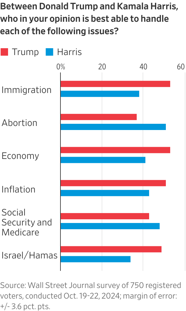 Trump’s advantage on handling immigration comes as he has focused heavily in his campaign appearances lately on casting illegal immigration as a danger to Americans’ personal safety and job opportunities. Some 23% of voters said immigration was the top issue motivating their choice of candidate, the largest share in Journal polls dating back a year and a half.