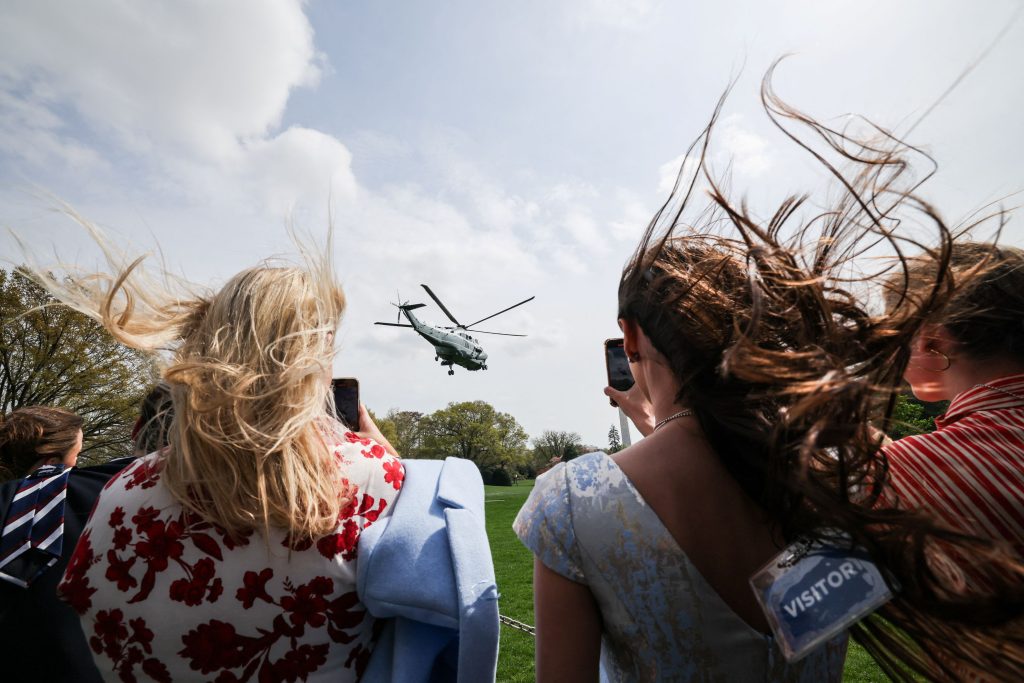 People use phones as Marine One carrying U.S. President Donald Trump takes off, as he departs the White House en route to Florida, in Washington, D.C., U.S., April 3, 2025. REUTERS/Carlos Barria